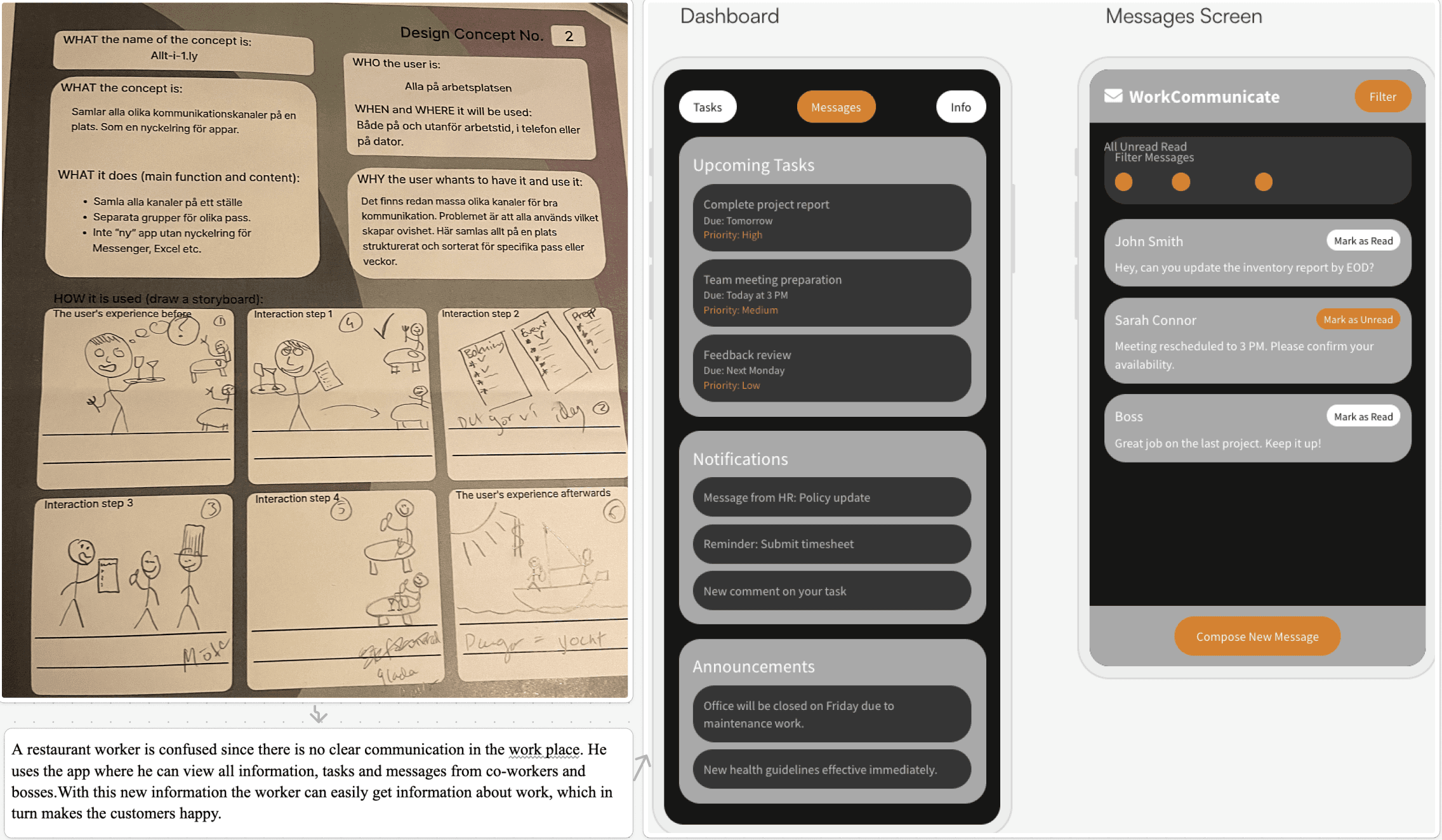 Stakeholders actively contributed by sketching workflows, creating storyboards, and testing AI-generated wireframes.